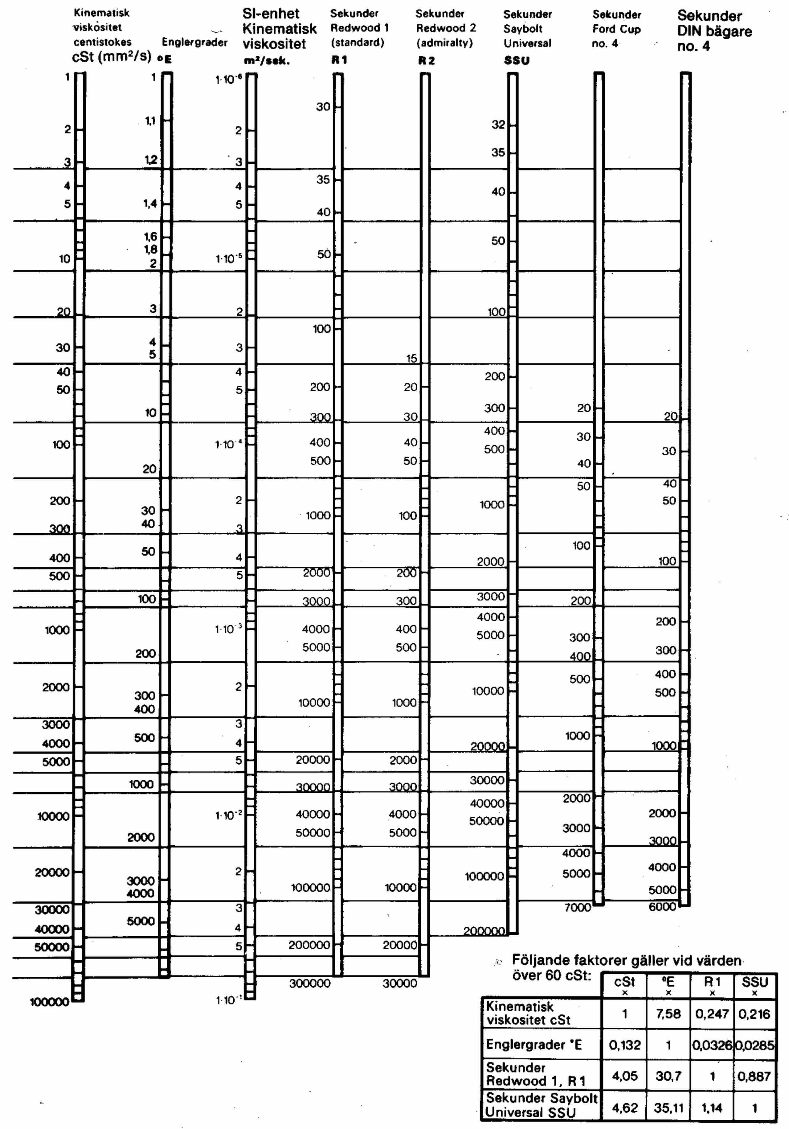 Tabell 10.1 Omräkningsdiagram för olika viskositetsenheter.