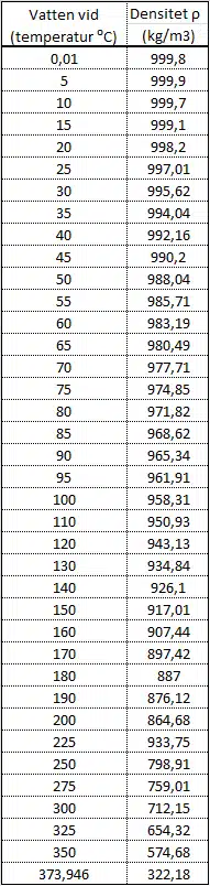 Vattens densitet är störst vid 4°C = 1000 kg/m³ då vatten har sin minsta volym. Vatten intar härigenom en särställning bland vätskor. Vid avkylning under 4°C utvidgar sig vattnet ända till 0°C och fryser till is, varvid volymen ökar med 9 %. Isens densitet är då 917 kg/m³.