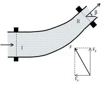 Innebörden av impulsekvationen illustreras genom följande exempel (Figur 11.8a och 11.8b). Problemställningen är att bestämma den inspänningskraft, som erfordras för att hålla en rörböj på plats.