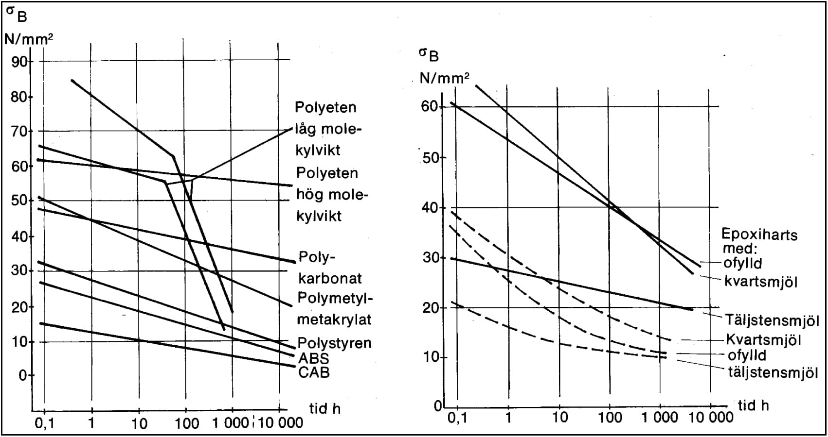 För plastmaterial minskas hållfastheten kraftigt med tiden -s k krypning. Förloppet sker snabbare vid ökad temperatur och även i vätskor. Figur 4.5 visar några värden för krypning i luft. Vid upphandling av pumpar i plast, särskilt för riskfyllda vätskor, bör motsvarande uppgifter för den aktuella vätskan anskaffas från pump- eller materialleverantör.
