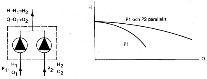 Vid parallellkoppling erhålles den resulterande Q-H-kurvan genom att för varje H-värde addera de aktuella volymströmmarna, enligt figur 8.8.