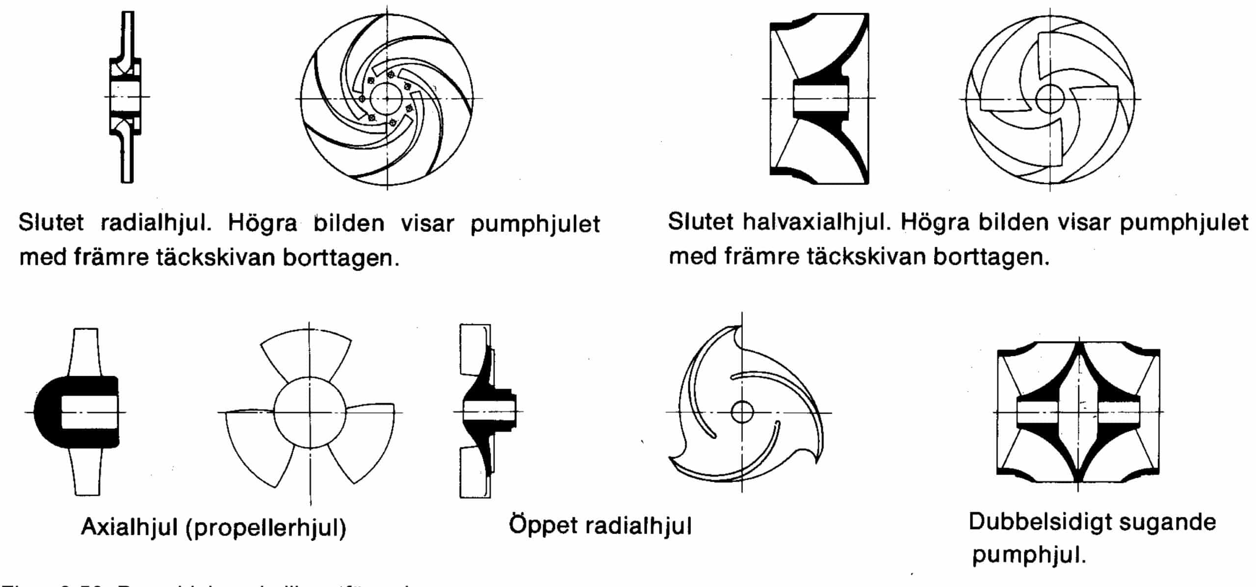 Alltefter strömningsvägen genom pumpen benämns pumphjul (och även hela pumpen) som radialhjul, halvaxial- och axialhjul (propellerhjul) enligt figur 3.50. Mellanformer till de i figuren visade pumphjul finns i obegränsad omfattning för att varje prestandabehov skall kunna uppfyllas.