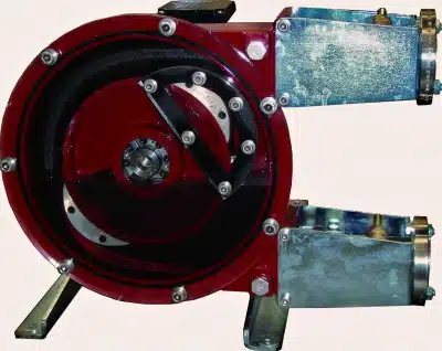 Eftersom rotorn roterar, är den del av slangen som är i kontakt med tryckskon i kläm mellan tryckskon och huset vilket tvingar vätskan som ska pumpas att röra sig i rotationsriktningen genom slangen.